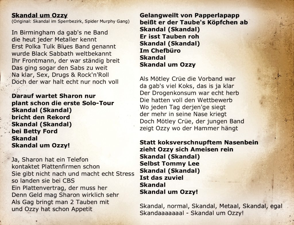 Major Ralph musste auf dem Boden bleiben und auch der Skandal um Ozzy bleibt leider unbesungen – zumindest was die Idee einer entsprechenden Cover-Version zu „Skandal im Sperrbezirk“ angeht. Wir finden das sehr schade. Ein weiterer Song für die abgelehnten Cover-Versionen 🙁